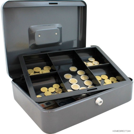 Fabrycznie nowa, wysokiej jakości metalowa kasetka do przechowywania lub transportu monet, banknotów lub innych wartościowych przedmiotów.