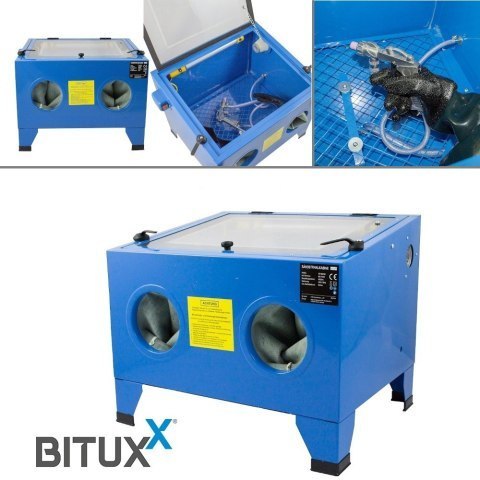 Kabinowa piaskarka marki BITUXX o pojemności 90L wykonana została z najwyższej jakości materiałów o podwyższonej odporności na uszkodzenia mechaniczne. Skutecznie wyczyścisz, usuniesz starą farbę oraz rdzę z różnych przedmiotów. Idealny do małych warsztatów. Dzięki oświetlonej 90-cio litrowej kabinie oraz wymiennych foliach PCV (5 folii w zestawie) praca jest łatwa i przyjemna. Dołączony w zestawie pistolet wyposażony jest w ceramiczne dysze, które charakteryzują się wysoką trwałością, posiada złącze 3/8" oraz 4 wymienne dysze (każda do innego rodzaju pracy). Aby móc pracować pistolet musi być podłączony do kompresora.