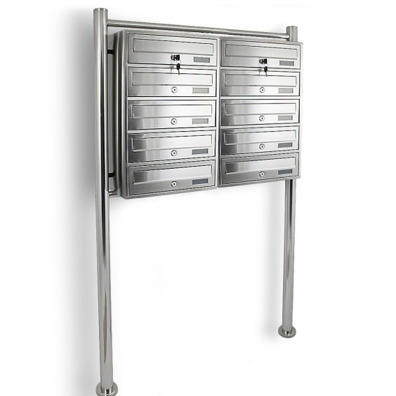 Metaliczna skrzynka na listy 2×5 (10 wrzutów) ze stali nierdzewnej – trwała, nowoczesna i stojąca; idealna dla wspólnot mieszkaniowych i osiedli.