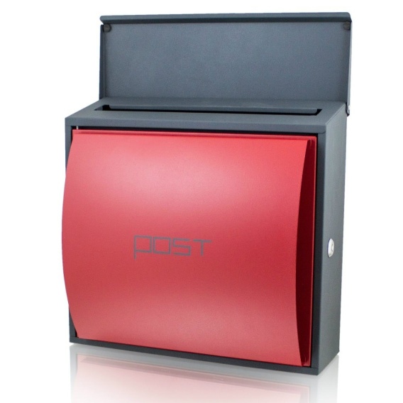 Ciemnoszara  skrzynka z uchwytem na gazety z czerwonymi drzwiami, lakierowana proszkowo