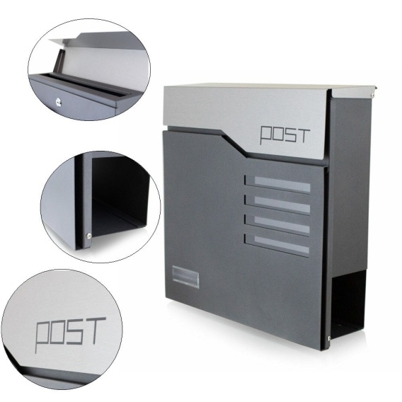 Grafitowa stalowa skrzynka na listy z gazetnikiem – elegancka, trwała i odporna na warunki atmosferyczne; idealna do domu, biura lub przy wejściu.