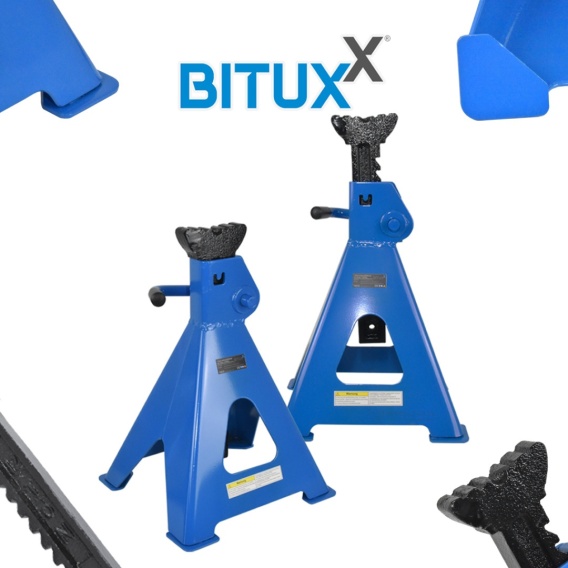 Zestaw 2 sztuk kobyłek warsztatowych Bituxx o udźwigu 12 t każda. Regulacja wysokości 48,7-74,8 cm, stalowa konstrukcja, idealna do warsztatu i garażu.