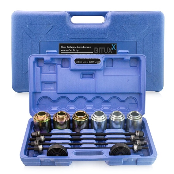 Profesjonalny zestaw narzędzi Bituxx, przeznaczony do demontażu i montażu łożysk, tulei gumowych („cichych łożysk”), uszczelek oraz tulei metalowo-gumowych. Dzięki bogatemu zestawowi tulei oraz mocnych wrzecion, zestaw umożliwia bezpieczne prace bez uszkadzania części.